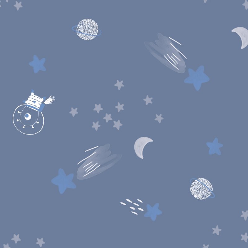 Felpa de invierno con el interior de pelo suave y cálido. Estampado de planetas, lunas y aliens sobre un fondo azul. Realiza conjuntos de chándal para tus peques con nuestros patrones de pantalones y sudaderas de la revista MiniMe Otoño Invierno 21/22.