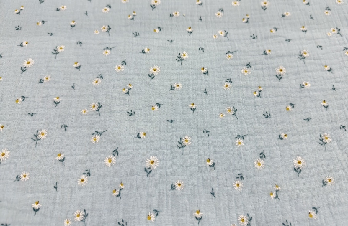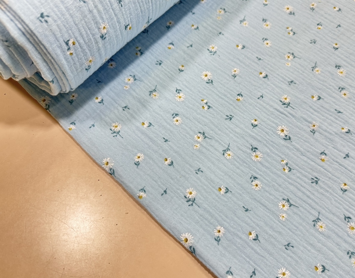 Es un tejido delicado, super suave y perfecto para la delicada piel del bebé. Posee dos capas juntas de la misma tela unidas en muchos puntos que hace imposible separarlas, por eso se la conoce también como doble gasa. Tiene una textura ligeramente arrugada, muy similar a la bambula.