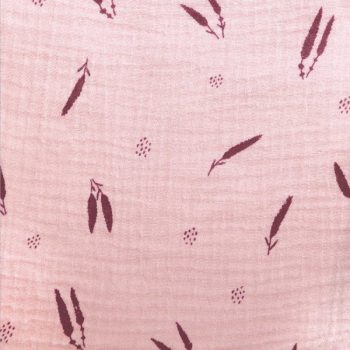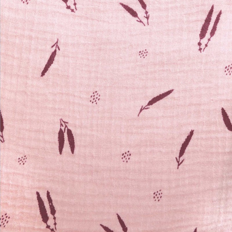 Muselina de algodón 100% con estampado de lavandas sobre fondo rosa. Tela muy suave y agradable al tacto, de doble capa, ideal para prendas y accesorios de bebé y niños.