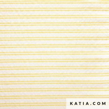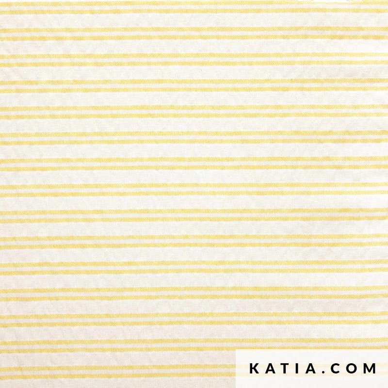 Tejido de calada con base de algodón y ligeramente strech, con un suave efecto arrugado. Listado vertical en color amarillo sobre blanco de inspiración náutica para crear looks muy veraniegos y playeros. Cose vestidos, blusas, petos y también accesorios como pañuelos, pareos o toallas de playa.