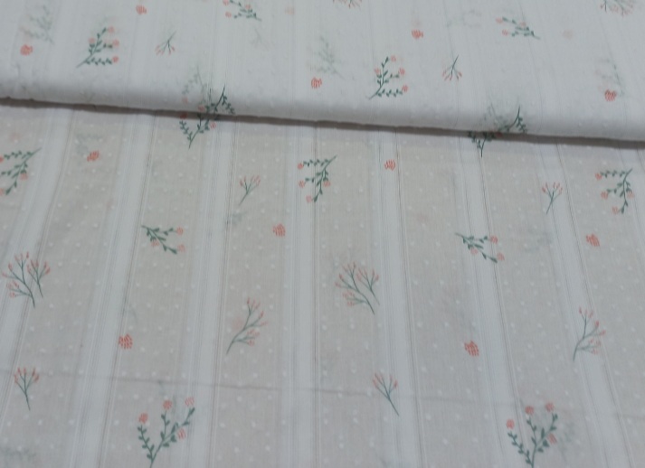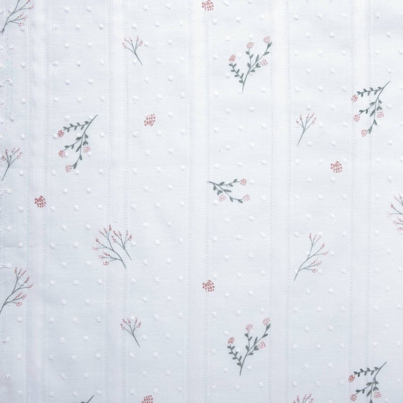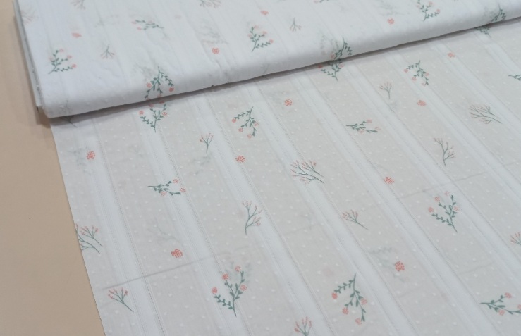 100% algodón batista plumeti , con un bordado vertical de aspecto fino, fresco y suave. Estampado de delicadas ramas de flores sobre un fondo blanco. Un tejido de alta calidad para realizar prendas elegantes para toda la familia.