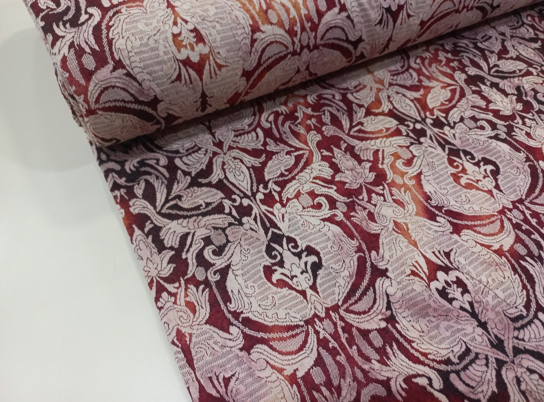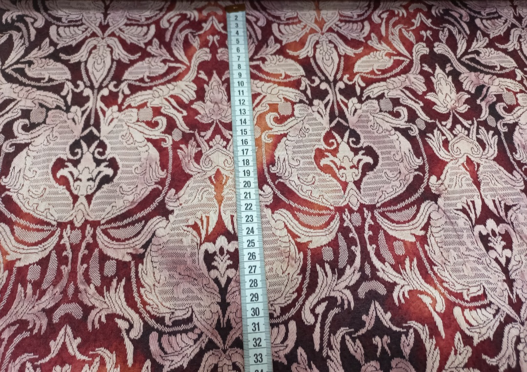 Tela de punto. Con fondo rojo/burdeos y beig , con un dibujo de cretona. Ideal para prendas como vestidos, pantalones, sudaderas o cardigans.