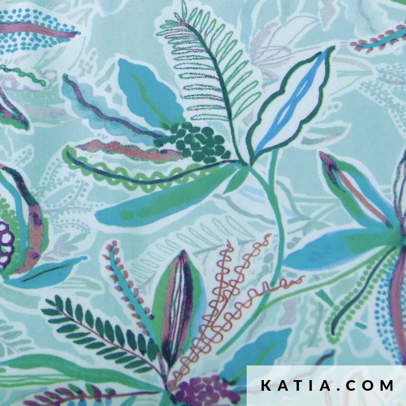 Turquoise Leaves Chalis es una tela de viscosa con un estampado botánico vibrante y lleno de dinamismo, ideal para prendas ligeras y con caída. Su tacto suave y fluido la hace perfecta para coser vestidos, faldas, blusas o pantalones cómodos y con movimiento. Una opción versátil y fresca para tus proyectos de costura más veraniegos.